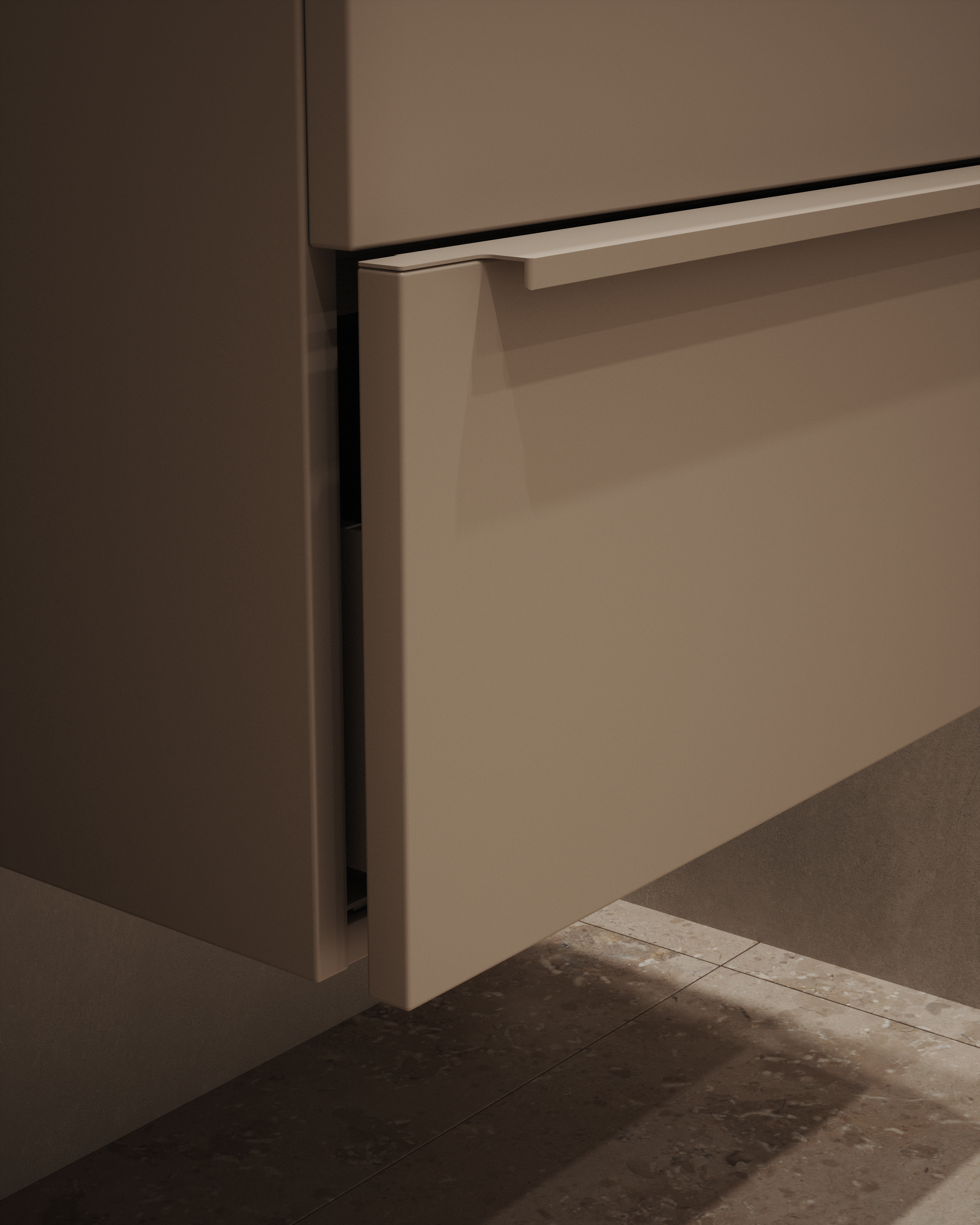 Tässä kylpyhuoneessa olemme valinneet beigen, hiekan ja pronssin sävyjä. Ne luovat yhdessä pehmeän ja tasapainoisen tunnelman, jota tukevat harkitut suihkutilaratkaisut ja kalusteet, jotka yhdistävät säilytystilan ja toiminnallisuuden tyylikkäällä tavalla.