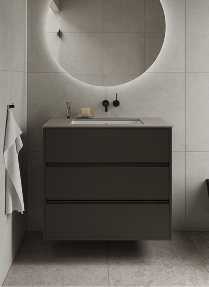 Fog on paletti mustan ja harmaan sävyissä – hillitty kokonaisuus, jossa on arkkitehtonista läsnäoloa. Seinät on verhottu Stenvide Fog -laattaan, gotlantilaisesta kalkkikivestä inspiraationsa saaneeseen graniittikeramiikkaan, jonka vaaleanharmaat vivahteet luovat rauhallisen ja ajattoman perustan. Lattiaan ja suihkutilaan on valittu Alvaret Ash – lämpimän harmaa graniittikeramiikka, jonka alkuperä on öölantilaisessa kalkkikivessä. Sen ilme on elävämpi ja rosoisempi, luonnollisine vaihteluineen ja tunnokkaine pinnanpainoineen. Vaalea kivi kohtaa sisustuksen ja metallien savuiset ja tummat yksityiskohdat, jotka tuovat syvyyttä ja luonnetta rikkomatta kokonaisuuden harmoniaa. Tuloksena on kylpyhuone, jossa pohjoismainen tyyneys kohtaa hienovaraisen dramatiikan – varjoissa ja tarkkaan harkituissa yksityiskohdissa.