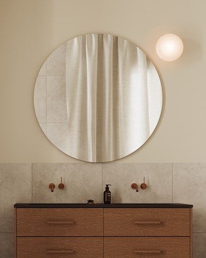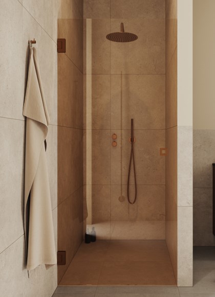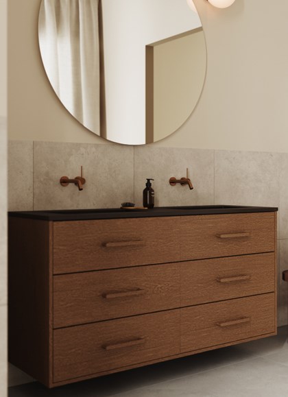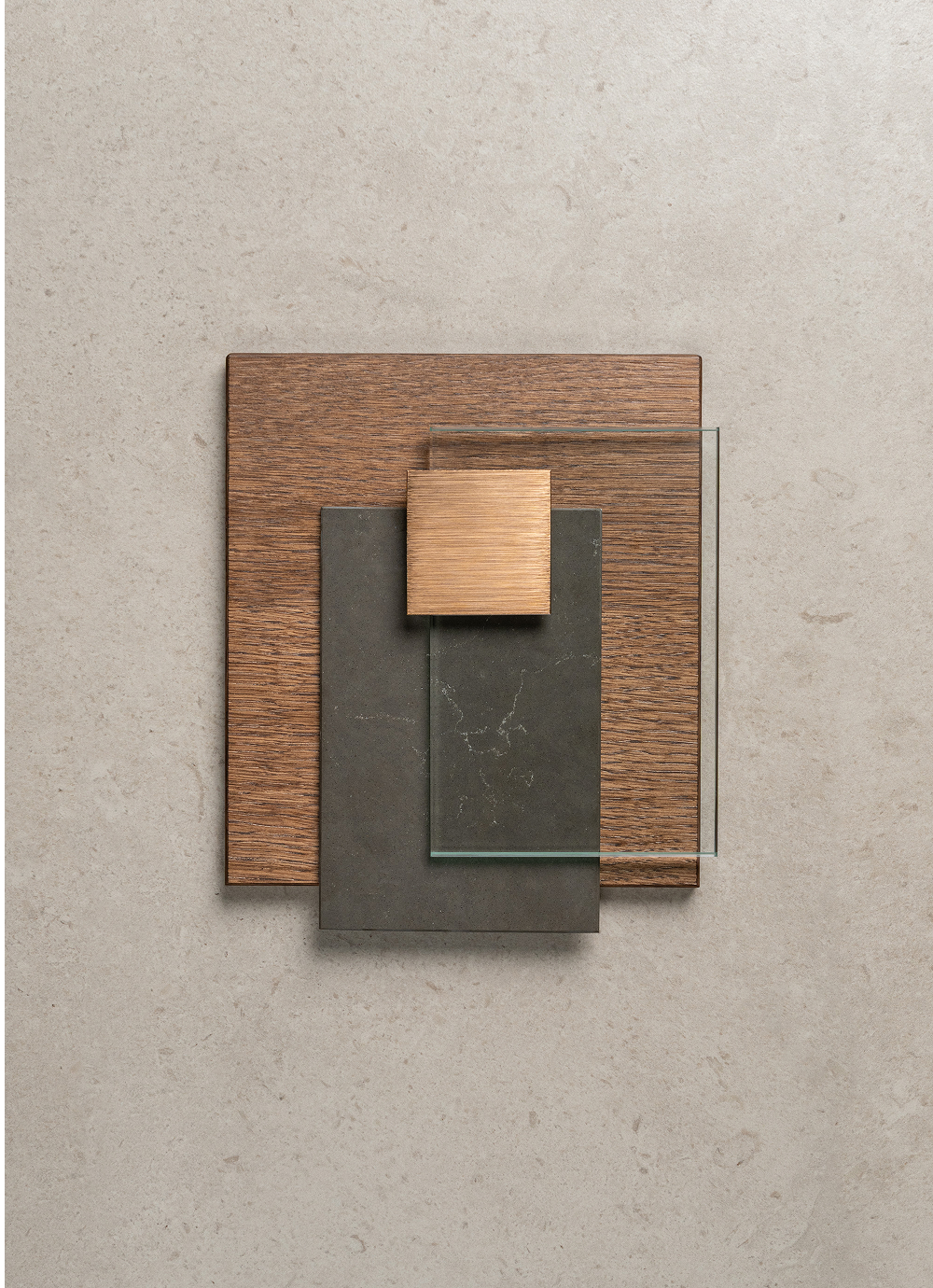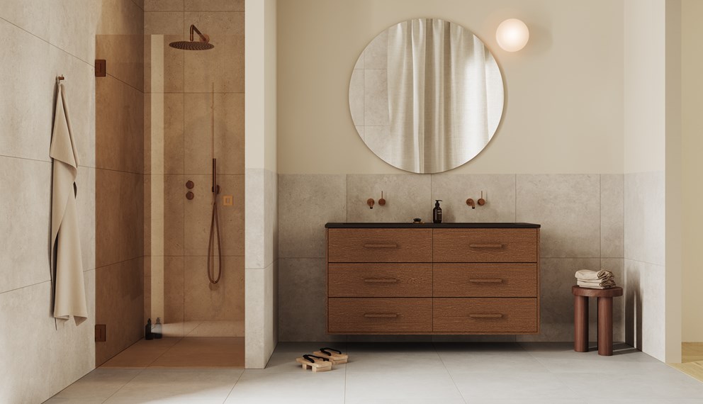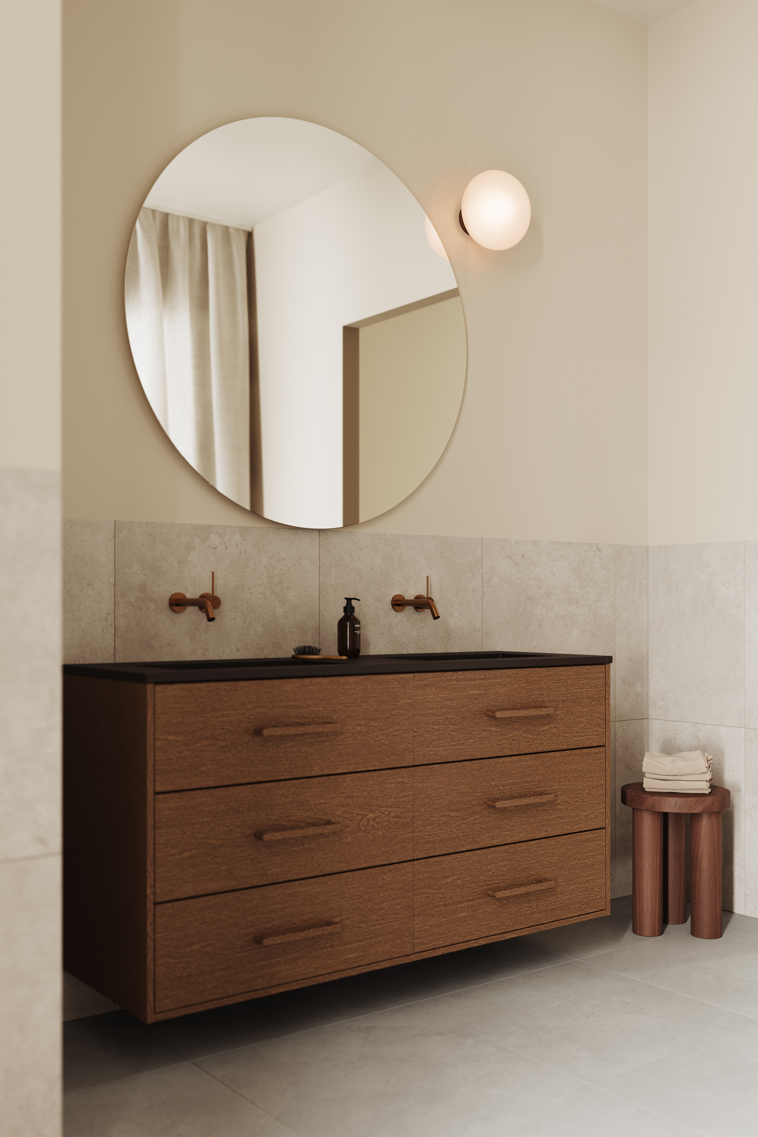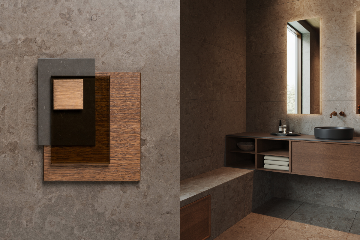 Hay perustuu vaalean ja tumman kontrastiin, luoden skandinaavisen ilmeen, jossa on syvyyttä ja eleganssia. Stenvide Hay -granitikeramiikka seinissä yhdistyy Stenvide Fog -laattoihin lattialla, vaaleisiin Gotlannin kalkkikiven sävyihin hillityillä vaihteluilla, jotka luovat rauhallisen ja ilmavan pohjan. Vaaleaa vasten kalusteet erottuvat tummasta tammiviilusta ja lämpimistä pronssisävyistä, tuoden tilaan syvyyttä ja luonnetta. Hay on paletti sinulle, joka haluat skandinaavisen kylpyhuoneen lämpimillä puusävyillä, tasapainoisilla kontrasteilla ja ajattomalla läsnäololla.