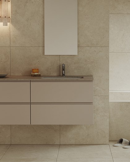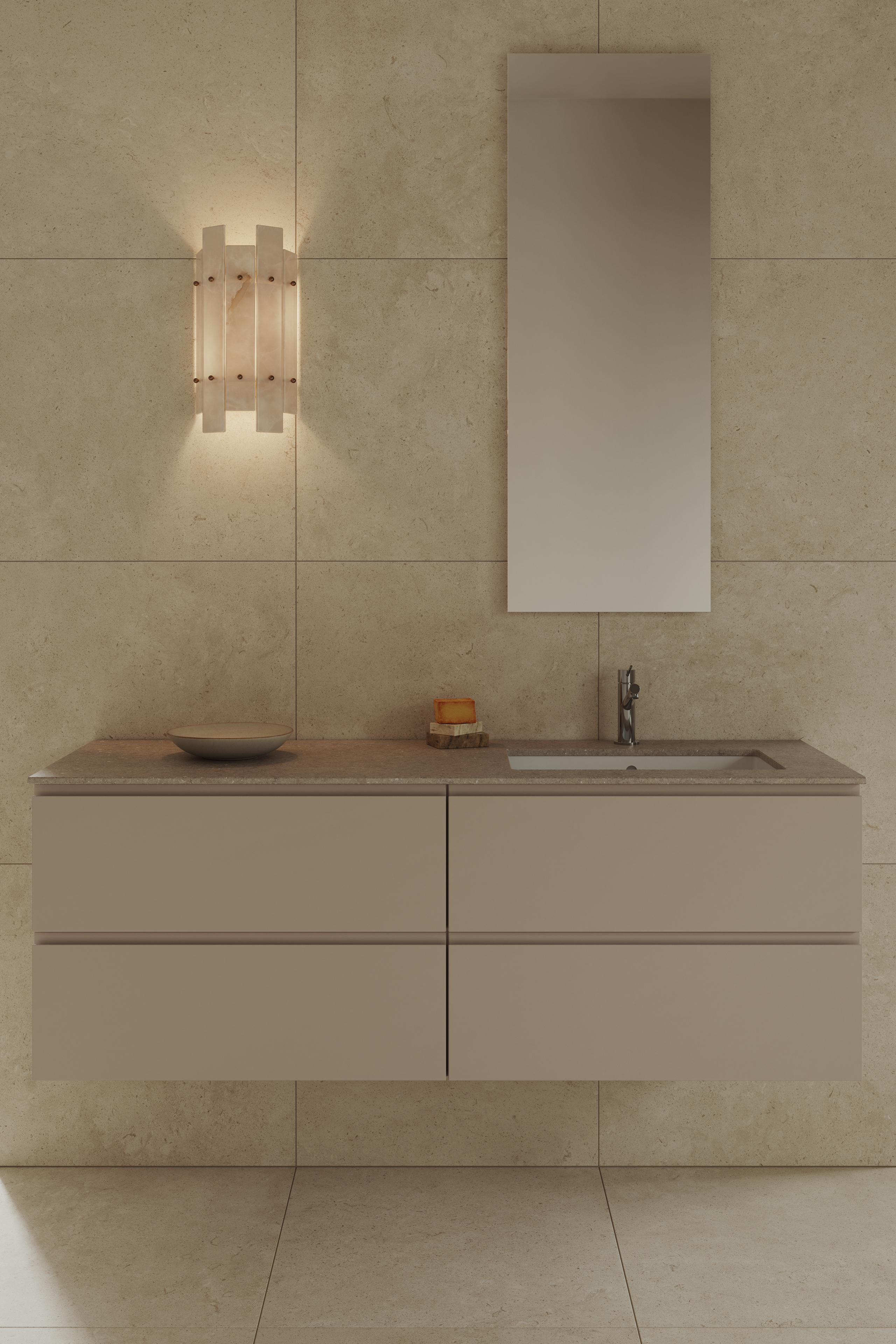 Linen on lämmin skandinaavinen paletti, jossa hiekan ja pellavan sävyt sulautuvat toisiinsa ja luovat rauhaa. Ilme on hillitty, vaalea ja tasapainoinen – täydellinen sinulle, joka haluat luoda ajattoman kylpyhuoneen ilman voimakkaita kontrasteja tai tummia pintoja. Gotlantilaisesta kalkkikivestä inspiroitunut graniittikeramiikka Stenvide Linen muodostaa pehmeän pohjan, jossa on hienovaraisia sävy- ja kuvioeroja, tuoden tilaan taktiilista syvyyttä. Vaaleat kivipinnat sointuvat kauniisti yhteen lämpimän beigen sävyisen sisustuksen ja kiiltävien metallien kanssa – luoden rauhallisen kokonaisuuden, joka huokuu skandinaavista harmoniaa.