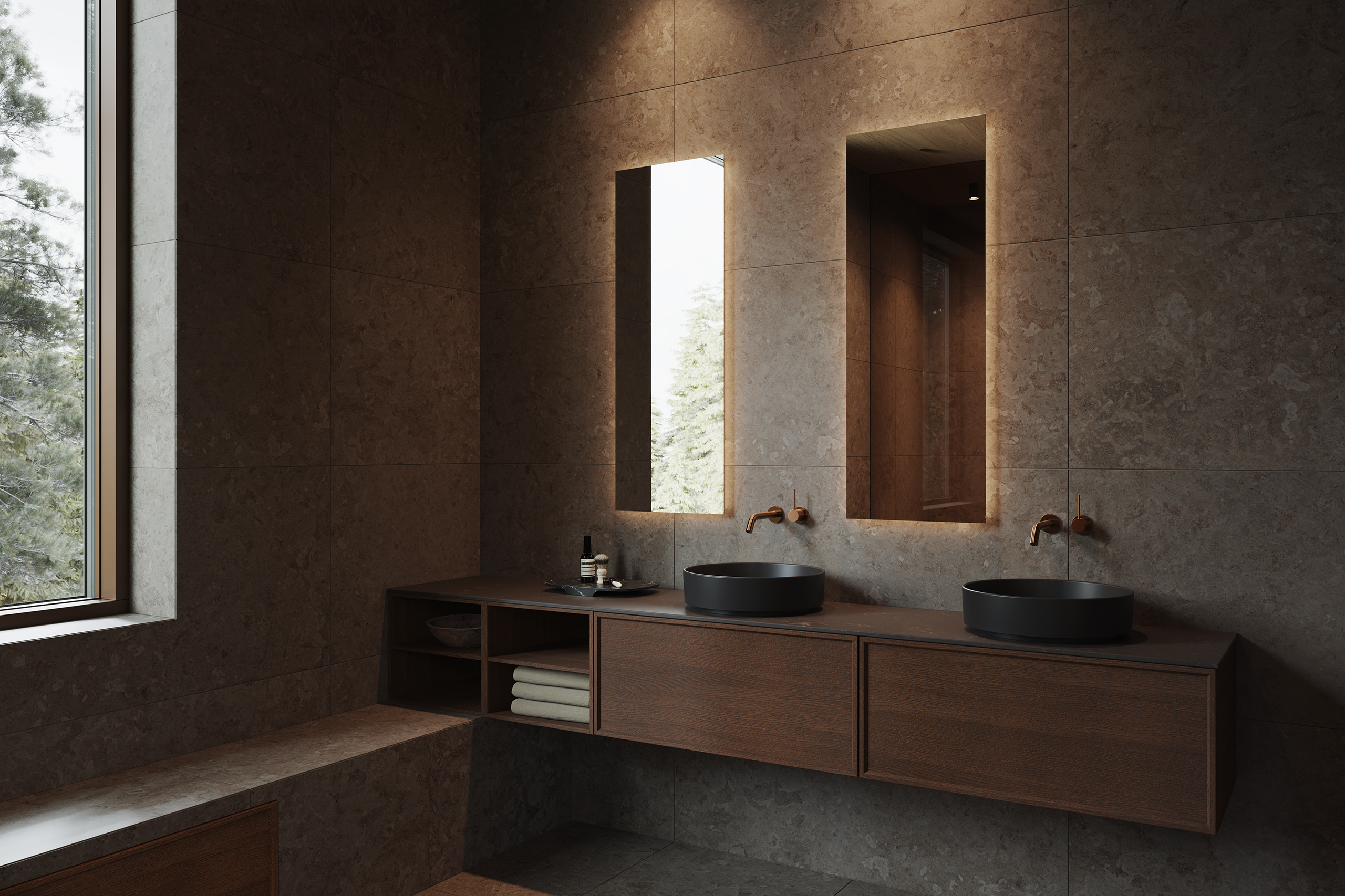 Air Wood Unlimited 40+40+80+80 sävyssä Dark Oak, yhdistettynä Plate-peiliin. Alvaret Earth 60x120.