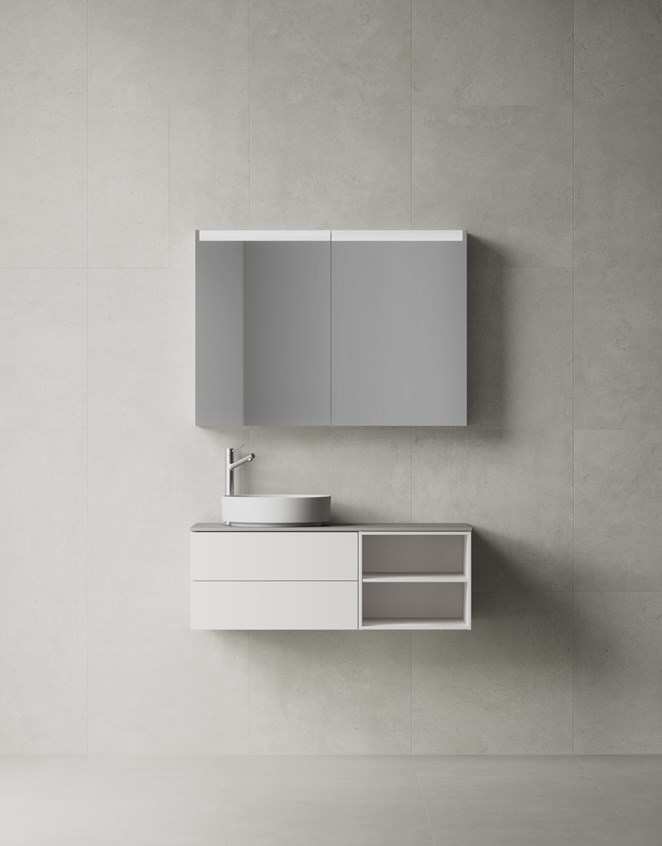 Leijuvan kevyt mutta samalla tilava. Air Solid huokuu minimalistista täydellisyyttä etusarjojen kevyesti pyöristetyt reunat ja sileä pinta tuo mieleen kalusteen, joka on saanut vaikutteita olohuoneen kalusteista. Kestävä pintalakka TX Top Extreme yhdessä pehmeästi ja vakaasti sulkeutuvien Grass-laatikoiden kanssa takaa kalusteen, joka kestää vuodesta toiseen. Voit valita kalustekokonaisuuden valmiista yhdistelmistä tai luoda oman kalusteesi yhdistelemällä erikokoisia yksiköitä. Valitse väreistä Premium White ja Accent/NCS. Yhdistä pyöreään mattavalkoiseen tai mattamustaan posliinipesualtaaseen. Valitse pohjaventtiili ja korkea hana. Pöytätasot ovat tilattavissa hanareiällä tai ilman. Sarjaan sopii parhaiten Push-mekanismi, mutta voit myös valita vetimen.Täydennä kalustettasi yhdellä tai useammalla lisävarusteella. Kalusteeseen on saatavana tunnelmaa luova, liiketunnistimella varustettu valaistus ja pistorasia. Jokaiseen 60/80 cm laatikkoon sisältyy vakiovarustuksena kaksi kätevää lokerikkoa, mutta voit halutessasi tilata lisää lokerikkoja.