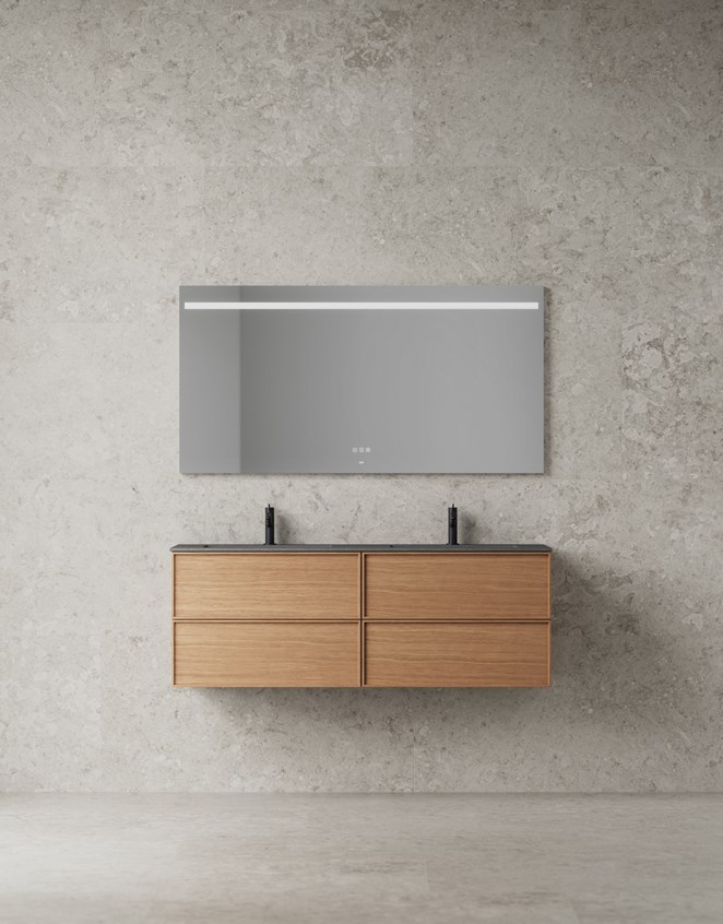 Allaskaluste, jossa sileä etusarja ja elegantti kehys, luo ylellisen vaikutelman. Kehykseen huomaamattomasti integroitu vedin tekee avaamisesta helppoa. Viilu tuo kokonaisuuteen modernin retroilmeen, tai valitse oma suosikkisävysi NCS-värikartasta – persoonallista tyyliäsi varten. TX Top Extreme™ -pintakäsittely suojaa kylpyhuonekalusteita kosteudelta ja kulumiselta. Valitse pesuallas kahdella altaalla tai pöytätaso altaalla – joko posliinista tai mattapintaisesta solid surface -materiaalista. Soft-close-mekanismi, liukuestematot ja lisävarusteet, kuten liiketunnistimella ohjattu valaistus ja kaksoispistorasia, tuovat sekä toimivuutta että mukavuutta.