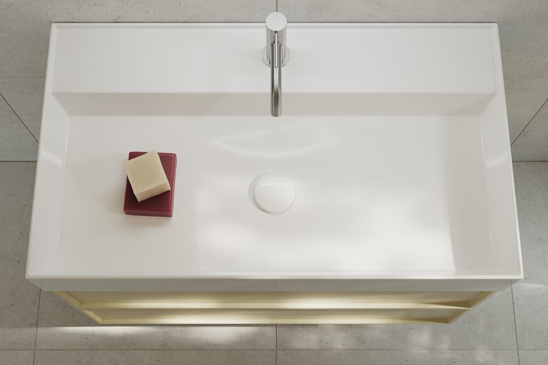 Tyylikäs allaskaluste, jossa kehyksen sisään piilotettu vedin takaa vaivattoman ja huomaamattoman avaamisen.