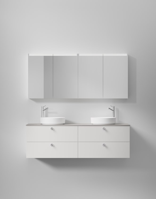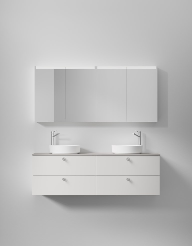 Solid 160 D-mallissa yhdistyvät tyylikkyys ja käytännöllisyys ja se on ihanteellinen ratkaisu suurelle perheelle. Kalusteessa on tuplapesuallas, ja voit valita kahdesta ratkaisusta: yhtenäisen pesualtaan kahdella altaalla tai pöytätason, johon on yhdistetty kaksi pyöreää tason päälle asennettavaa pesuallasta. Molemmat vaihtoehdot on valmistettu kestävästä solid surface -materiaalista, jonka mattapinta tuntuu miellyttävän lämpimältä kosketettaessa. Sileäpintaiset etusarjat edustavat ajattoman tyylikästä muotoilua, joka sopii moniin eri sisustustyyleihin. Räätälöi allaskaluste tarpeidesi mukaan valitsemalla eri avausvaihtoehdoista, kuten push open -mekanismista, ja viimeistele kokonaisuus älykkäillä lisävarusteilla, kuten liiketunnistimella ohjatulla valaistuksella ja integroidulla kaksoispistorasialla, jotka lisäävät käyttömukavuutta ja toiminnallisuutta.