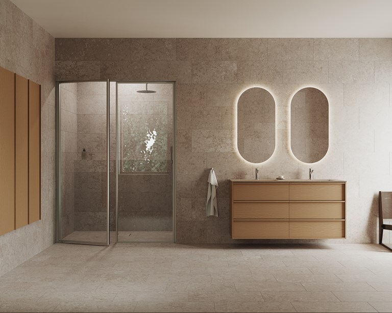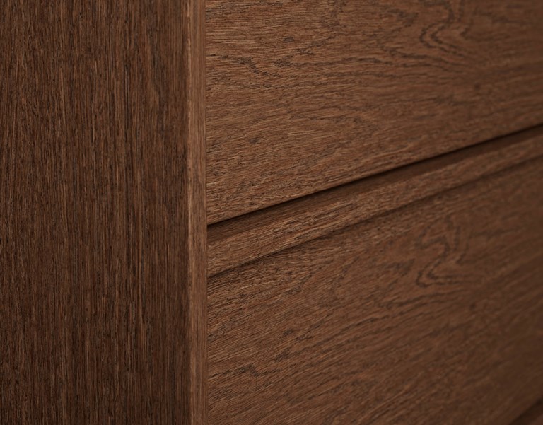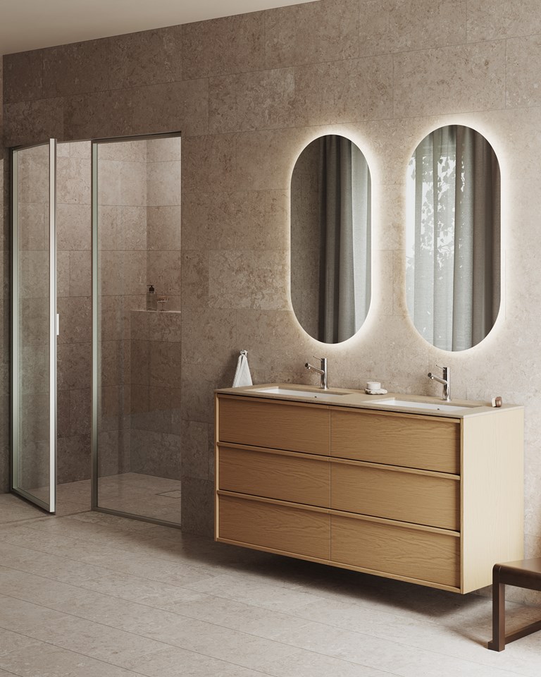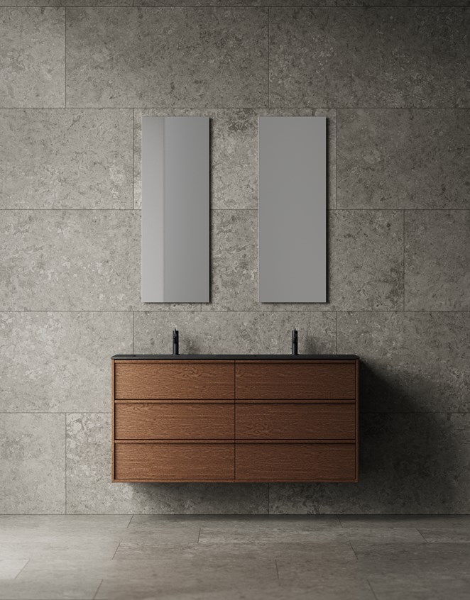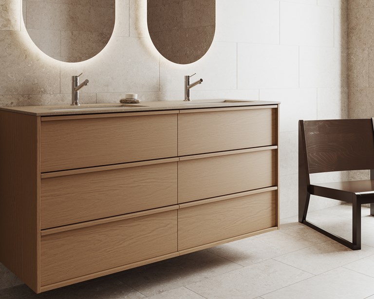 Kaksi pesuallasta ja kuusi tilavaa laatikkoa tekevät Terra Carve 140 D:stä kalusteen, joka tarjoaa runsaasti säilytystilaa – ja ilmeen, joka kerää katseet. Integroidulla vetimellä viimeistelty etusarja korostaa skandinaavista muotokieltä ja tuo esiin Natural Oak- tai Dark Oak -viilun kauniin pinnan. Suurempi kuviointi kuin muissa sarjoissamme antaa puulle elävää syvyyttä ja tekee kylpyhuoneen ilmeestä lämpimän ja persoonallisen. Korkea 70 cm runko ja kuusi täysin ulosvedettävää laatikkoa tarjoavat säilytystä tavallista enemmän – täydellinen ratkaisu perheen kylpyhuoneeseen, jossa tilan ja järjestyksen merkitys korostuu. Kaksi pesuallasta tekevät kalusteesta luonnollisen kokoontumispaikan – yhtä käytännöllinen kuin tyylikäs.