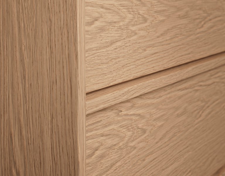 Viilupintainen korkea kaappi kahdella laatikolla ja massiivitammisella vedinuralla koko oven matkalla. Lisää lämpöä, luonnetta ja säilytystilaa jokaiseen hetkeen.