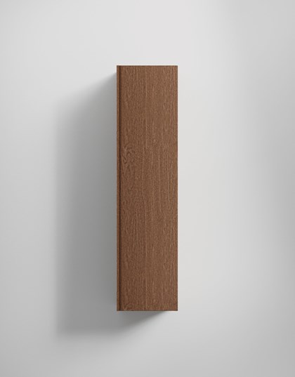 Kompakti korkea kaappi viilupinnalla ja massiivitammisella vedinuralla koko oven matkalla. Lämmin puutuntuma ja maksimaalinen säilytys pienessä tilassa