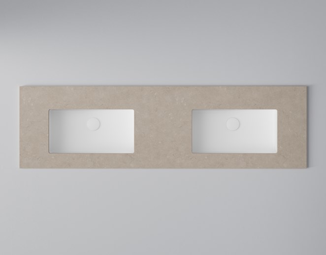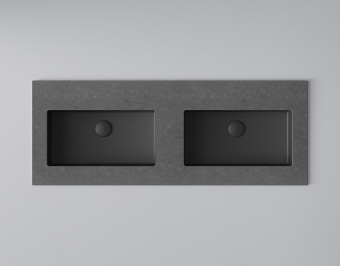 Piiloitetut, huomaamatomat vetimet allaskalusteessa, jossa on kaksi pesuallasta.