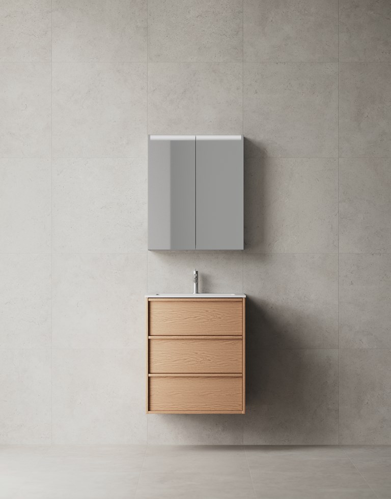 Terra Carve 60 on allaskaluste, joka ottaa tilansa – visuaalisesti ja käytännöllisesti. Sarjan ilmeeseen kuuluva etusarja, jossa massiivipuinen vetolista sulautuu muotoon, luo selkeän ilmeen ja korostaa kalusteen hienostunutta käsityön tuntua. Viilupinta erottuu suuremmalla kuvioinnillaan ja elävyydellään – se tuo kylpyhuoneeseen lämpöä ja persoonallista syvyyttä. Upotettu vetolista lisää kalusteeseen aitoa syvyyttä ja korostaa sen skandinaavista muotokieltä. Carve on saatavilla kahdessa viiluvaihtoehdossa: Natural Oak ja Dark Oak – sävyt, jotka syventävät materiaalin tuntua ja tuovat kylpyhuoneeseen maanläheisen ja lämpimän ilmeen. Kompaktista leveydestään huolimatta kaluste tarjoaa poikkeuksellisen paljon säilytystilaa: kolme täysin ulosvedettävää laatikkoa ja runkokorkeus peräti 70 cm. Kuten kaikki kalusteemme, Carve valmistetaan Ruotsissa ja se on käsitelty TX Top Extreme™ -pintakäsittelyllä, joka suojaa kosteudelta ja kulumiselta vähintään 15 vuoden ajan.