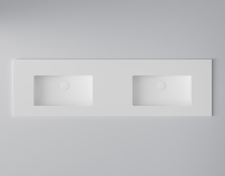 Allaskaluste, jossa on kuusi laatikkoa, integroitu vedinlista ja kaksi pesuallasta. Elegantti, toimiva ja ajaton.