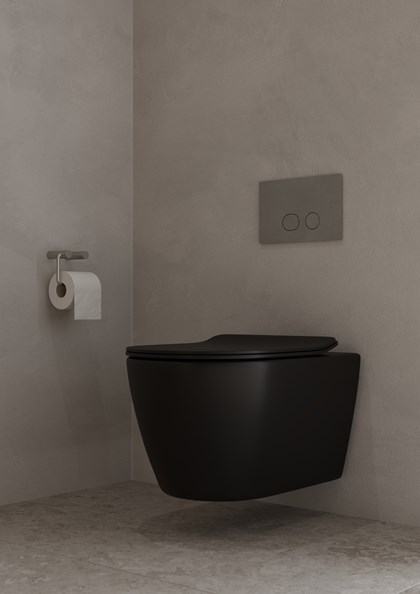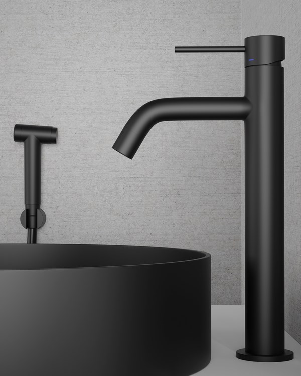 Posliininen/solid surface -materiaalista valmistettu pohjaventtiili vesilukolla. Asennetaan joko avoimena tai pop-up-mallisena.