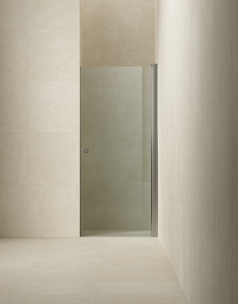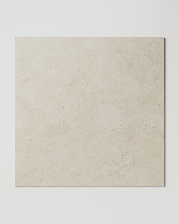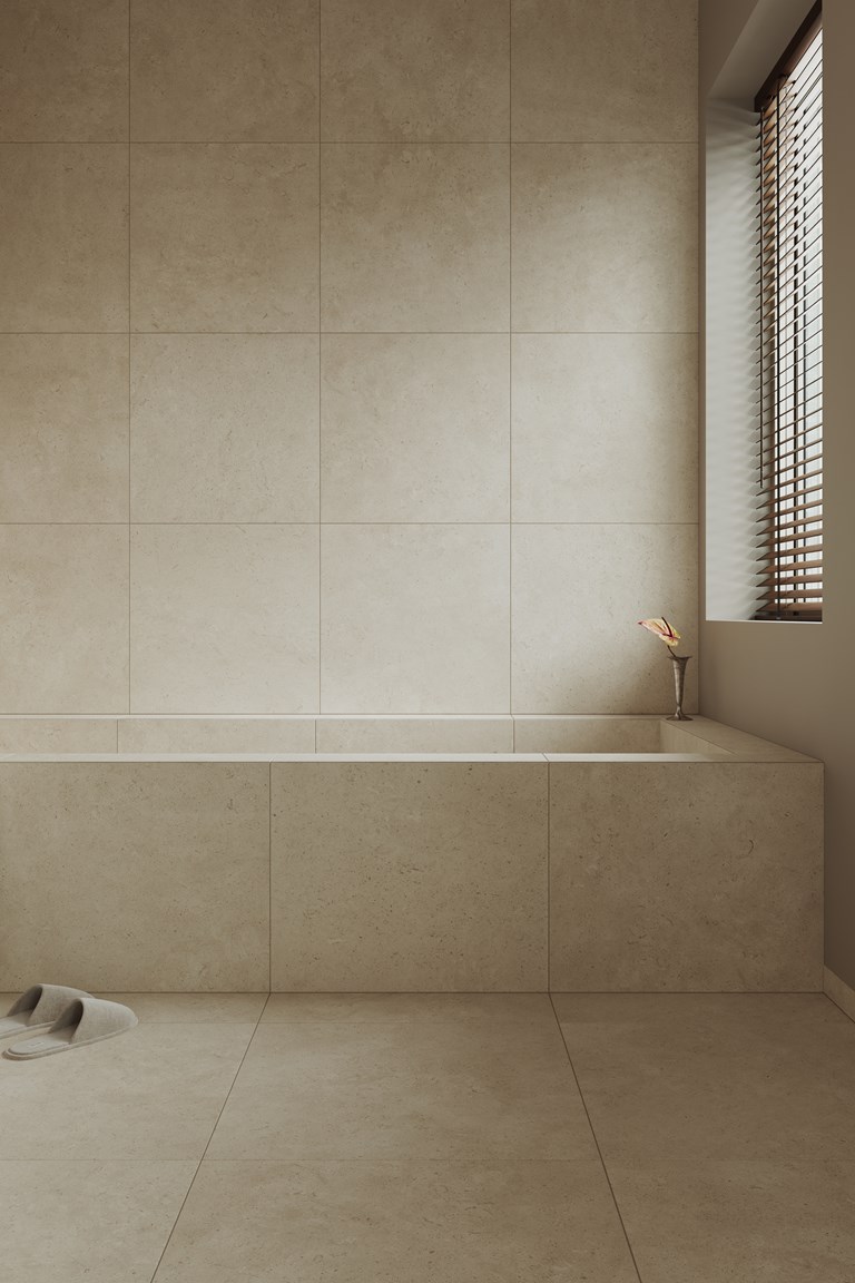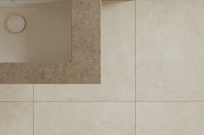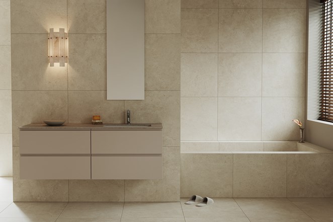 Klinkkeri, jossa öölantilaisen kalkkikiven elävä kuvio ja lämpimät beigensävyt tuovat kylpyhuoneeseen syvyyttä ja hienovaraista ilmettä.