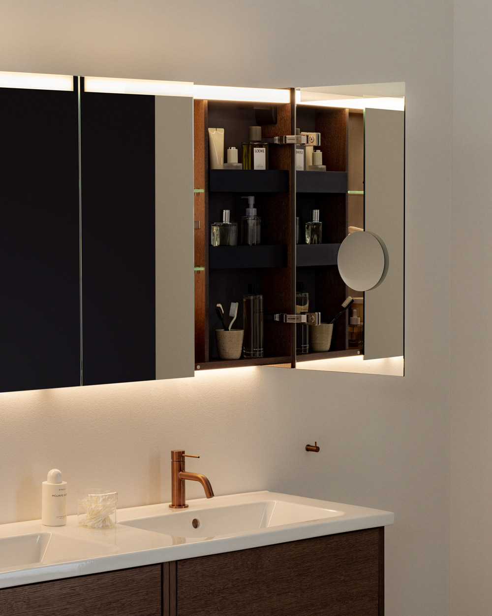 Tutustu peileihimme ja peilikaappeihimme. Oikeanalinen peili määrittää kylpyhuoneen tyylin ja antaa kylpyhuoneeseesi sekä valoa, syvyyttä että tilaa. Valitse käytännöllinen ja tyylikäs LED-valaistus lisäämään tunnelmaa. Peilimme ja peilikaappimme sopivat kaikkien allaskalusteidemme leveyksiin, ja niitä on saatavana sekä pyöreinä että neliön muotoisina. Peiliovien takana on monia jännittäviä ja käytännöllisiä toimintoja.