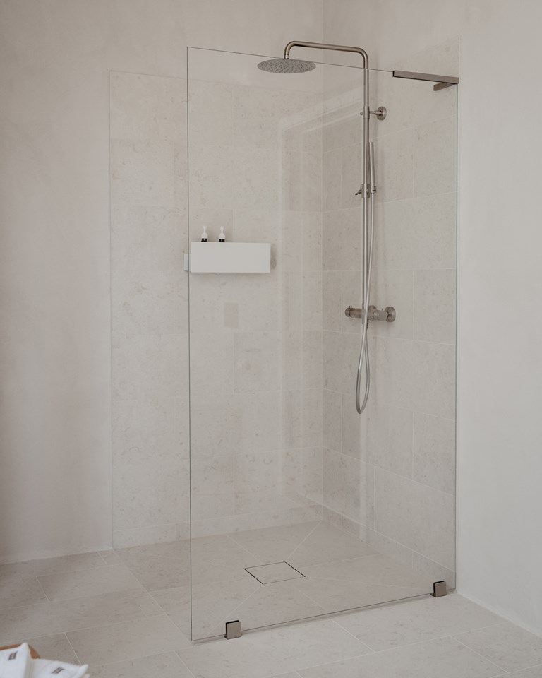 Kiinteä suihkuseinä 6 mm lasista. Räätälöidään maksutta ilmoitettujen mittavälien sisällä, mitta lattiasta kattoon saatavissa 2700 mm asti.