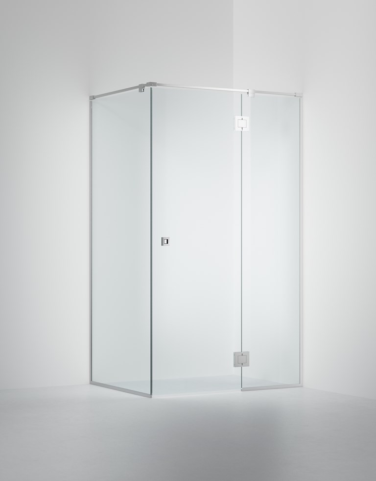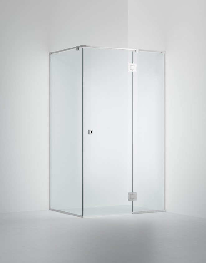 Suihkunurkka, jossa yksi kiinteä seinä sekä ovellinen seinä 8 mm lasista. Räätälöidään maksutta ilmoitettujen mittavälien sisällä. Helppo mukauttaa juuri omien mittojesi mukaan.
