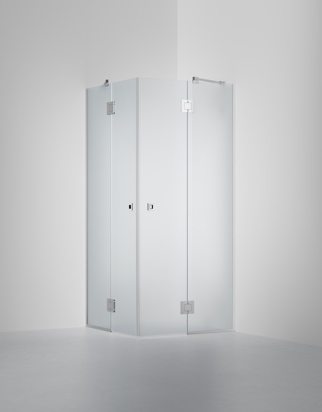 Suihkunurkka, jossa kaksi kiinteää ovellista seinää 8 mm lasista. Räätälöidään maksutta ilmoitettujen mittavälien sisällä. Helppo mukauttaa juuri omien mittojesi mukaan.