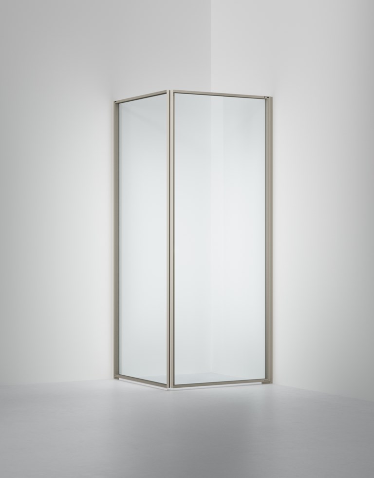 Suihkunurkka, jossa saranoidut ovet 6 mm lasista. Integroitu vedin. Saatavana vakiomittaisena 900 x 900 mm sekä myös mittojen mukaan räätälöitynä.