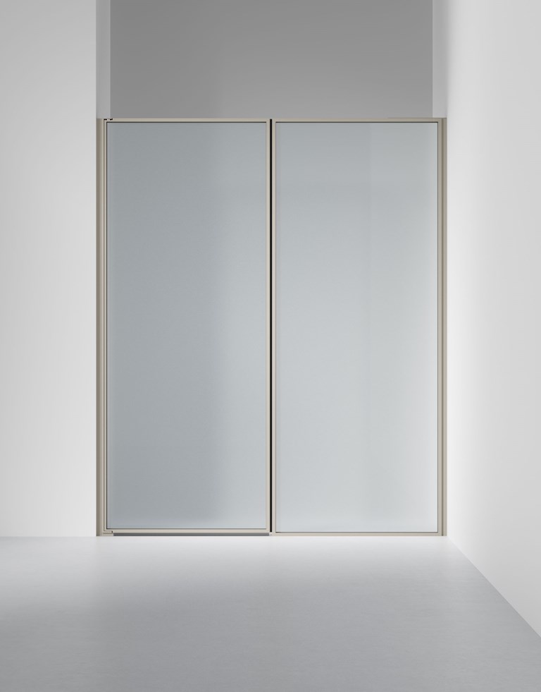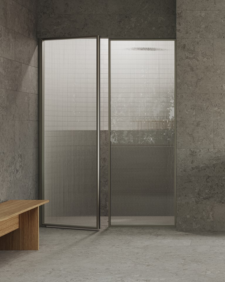 Suihkuratkaisu, jossa kiinteä seinä ja saranoitu ovi 6 mm lasista. Integroitu vedin. Räätälöidään maksutta ilmoitettujen mittavälien sisällä.