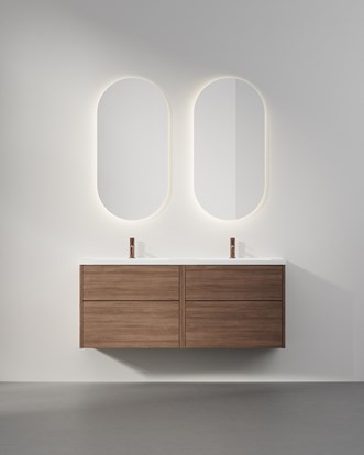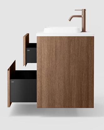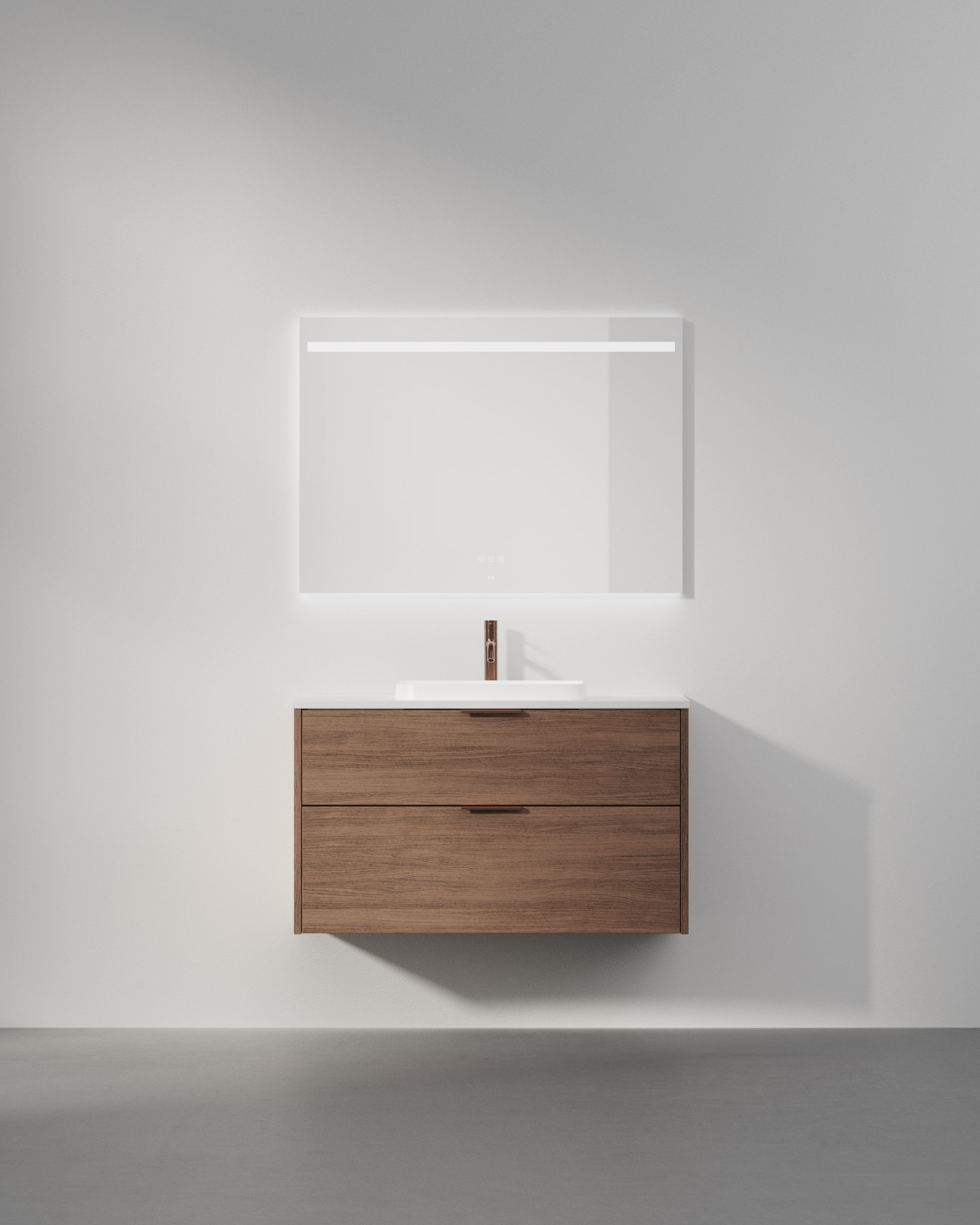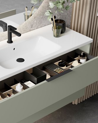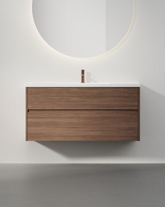 Kaluste huokuu harmoniaa ja tasapainoa tyylikkäästi upotetun vetimen ansiosta, joka sulautuu saumattomasti laatikoiden yhtymäkohtaan. Valitse Grand Grip ajattoman kauniina tammiviilupintana – viimeistelty kestävällä TX Top Extreme™ -pintakäsittelyllä, joka yhdistää ylellisyyden ja pitkäikäisyyden. Täydennä kokonaisuus valitsemalla joko täysin kattava posliiniallas tai upotettu allas eleganttiin pöytätasoon. Kokeile eri vaihtoehtoja studiossamme ja suunnittele oma, täydellisesti kalustekokonaisuutesi yhteensopivalla korkealla kaapilla. Kaikki allaskalusteet