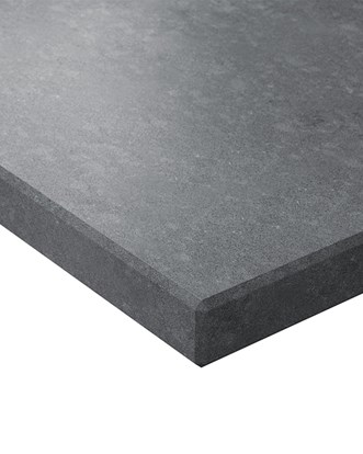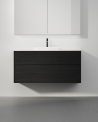 Grand Solid 120 Black Oak, yhdistettynä Raw Concrete -pöytätasoon ja mattavalkoiseen Level-pesualtaaseen.