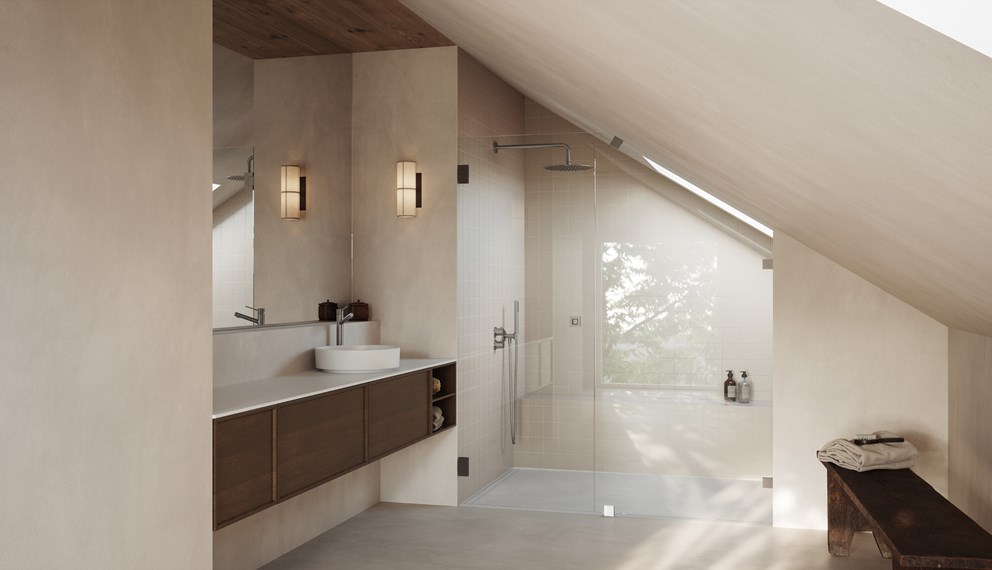Viistokattoiset kylpyhuoneet ovat tavallisia 1,5-kerroksisissa taloissa ja vanhoissa kiinteistöissä. Niiden sisustaminen saattaa aiheuttaa omat haasteensa. Nurkat ja viisto katto saattavat alkuun heittää kapuloita kylpyhuonesuunnittelijan rattaisiin, mutta itse asiassa viistokattoisiin kylpyhuoneisiin on saatavana useita näppäriä ratkaisuja. Toivottavasti vinkeistämme on hyötyä.