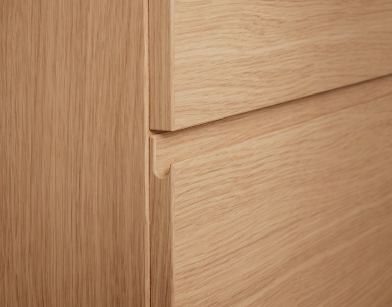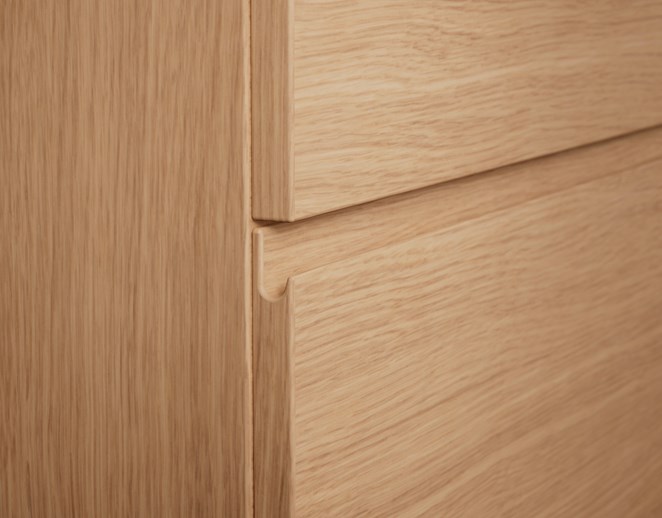 Allaskaappi, jossa yhtenäinen etulevy ja lokeroitu sisälaatikko. Sormiliitoksiset yksityiskohdat massiivitammesta. TX Top Extreme™.