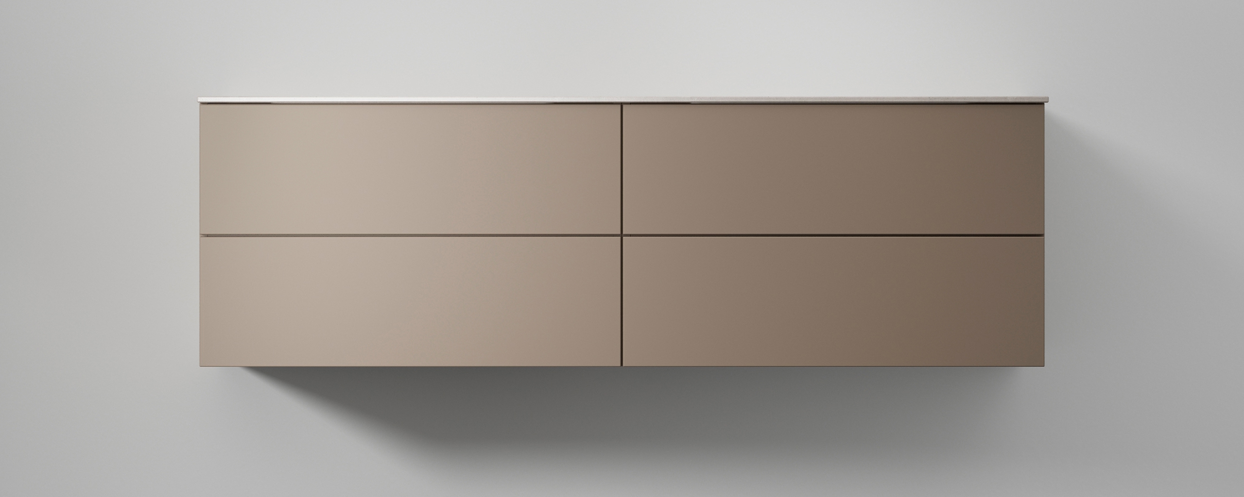 Tilavampi allaskaappi, jossa linjakkaat integroidut vetimet. Posliiniallas tai LEVEL-allas komposiittipöytätasolla. TX Top Extreme™.