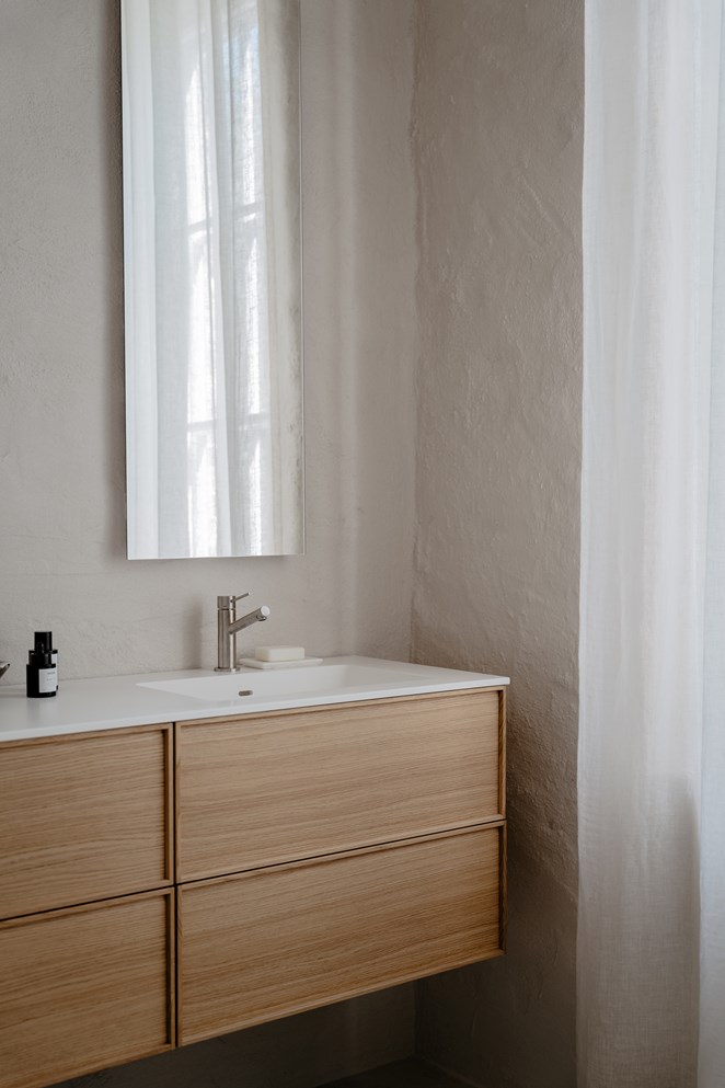 Core Avant 60 sävyssä Warm Clay, yhdistettynä seinäkaappiin Solid 40/15 ja Alvaret Clay 60x60 -laattoihin.