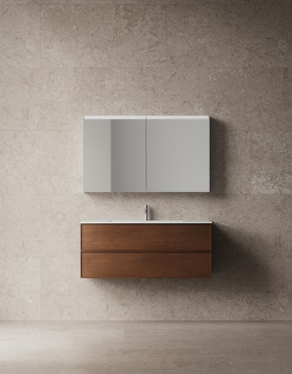 Huolellisesti muotoiltu allaskaluste, jossa kehyksen sisään piilotettu vedin.