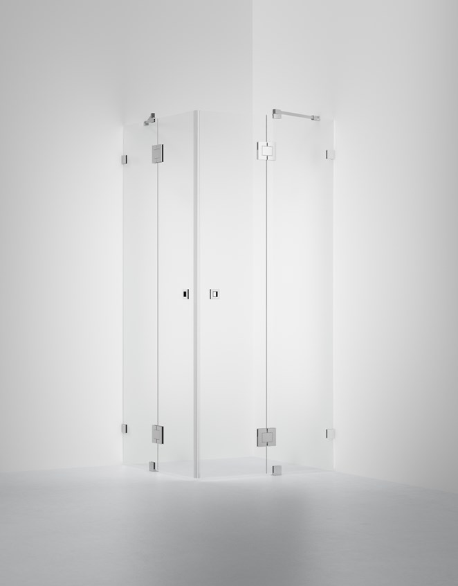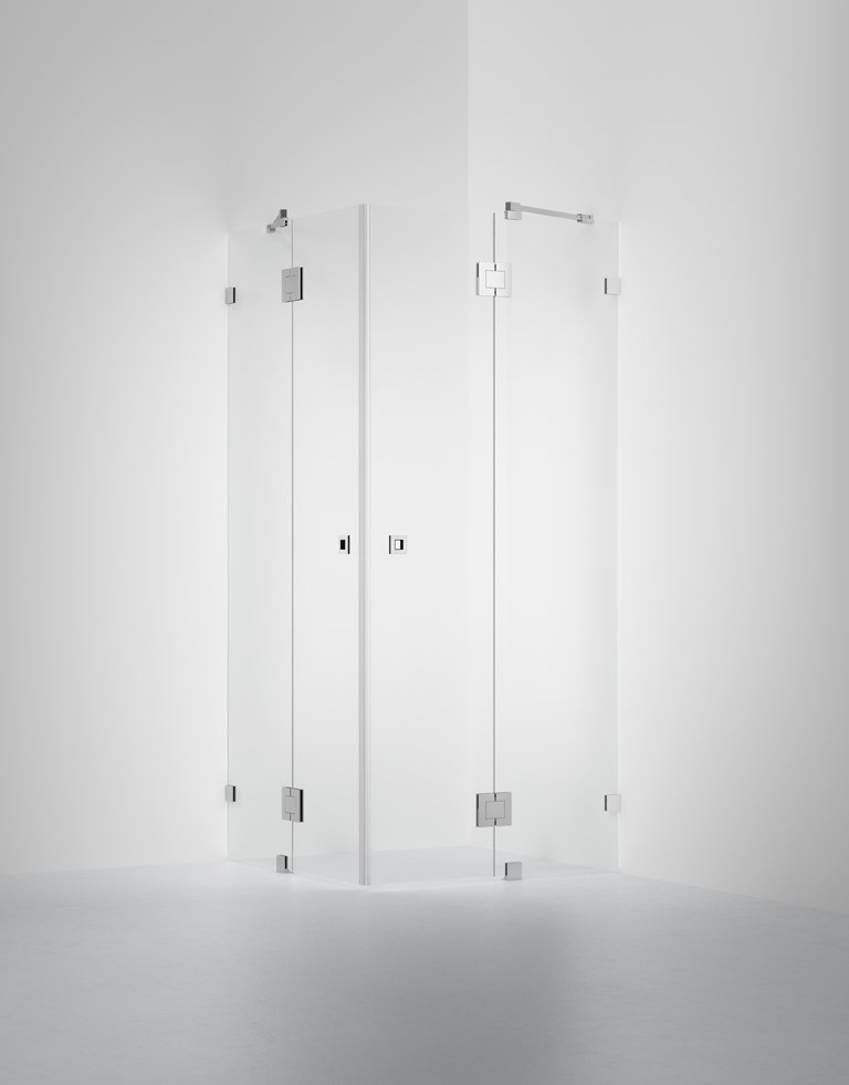 Suihkunurkka, jossa kaksi kiinteää ovellista seinää 8 mm lasista. Räätälöidään maksutta ilmoitettujen mittavälien sisällä. Helppo mukauttaa juuri omien mittojesi mukaan.