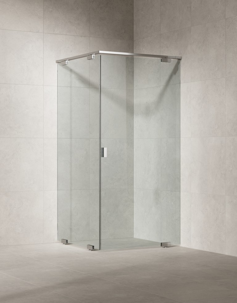 Suihkunurkka, jossa kiinteä seinä ja ovi 10 mm lasista. Avaa pivot-saranalla kiinnitetty ovi ja koe miten se avautuu höyhenenkevyesti. Räätälöidään maksutta ilmoitettujen mittavälien sisällä.