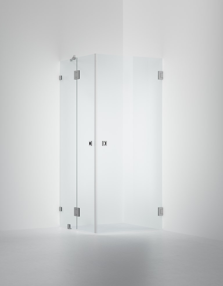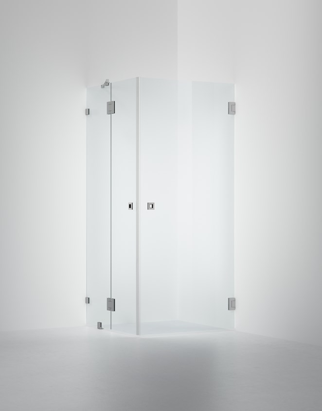 Suihkunurkka, jossa kapea kiinteä seinä ja kaksi ovea 8 mm lasista. Räätälöidään maksutta ilmoitettujen mittavälien sisällä. Helppo mukauttaa juuri omien mittojesi mukaan.