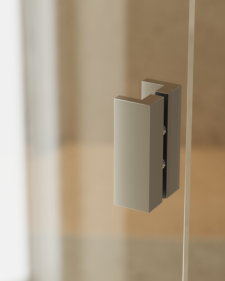 10 mm lasista valmistettu suihkuratkaisu, jonka pivot-saranalla kiinnitetty lasi kiertyy höyhenenkevyesti 360° akselinsa ympäri. Räätälöidään maksutta ilmoitettujen mittavälien sisällä.